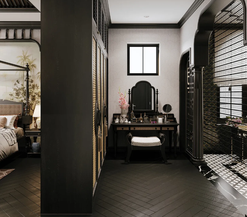 Kết hợp giữa phong cách Indochine với các yếu tố cổ điển như tường gạch và nội thất chạm khắc.