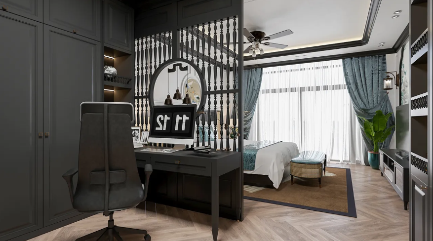 Thiết kế không gian đa năng, vừa là phòng ngủ vừa là không gian làm việc với sự tiện nghi và thẩm mỹ cao.