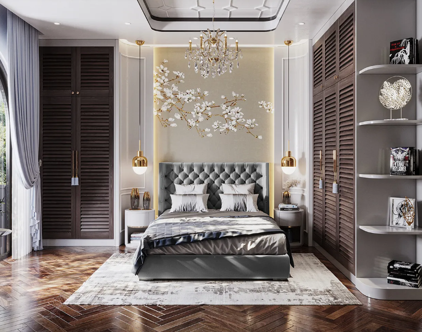 Thiết kế phòng ngủ với giường lớn, đầu giường chạm khắc tinh xảo và hệ thống đèn treo nghệ thuật.